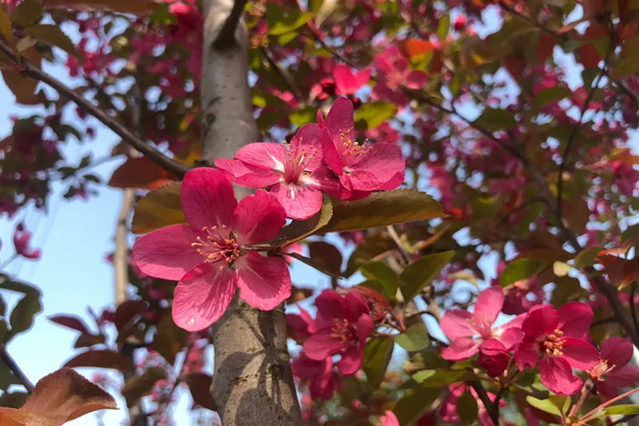 5. 紅葉海棠: 紅葉海棠是一種比較特殊的北美海棠,其葉子樹干等無(wú)部位均呈現(xiàn)出紅色,花朵為白色,花徑3-4cm,花期和其它海棠一樣,在4月至5月間。